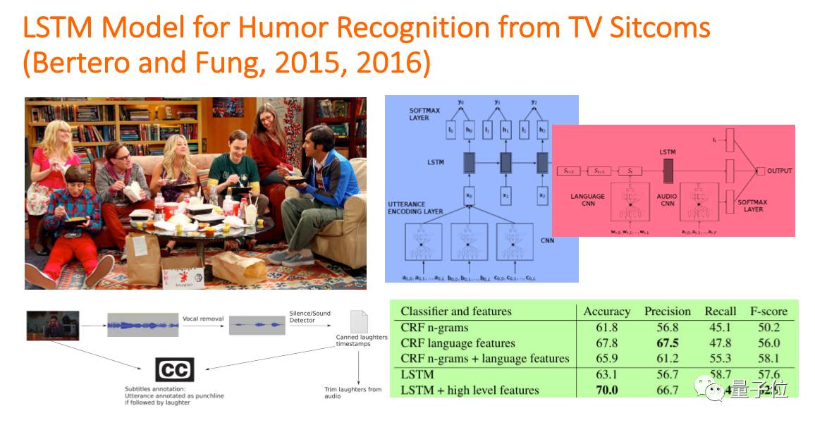 他怎么来实现的呢?也是分两步:第一步是识别,让机器来明白笑点,训练数据来源就是美剧的喜剧,因为所有的美剧中的喜剧在笑点出现都会哄堂大笑,那么大笑前这句话就具有对话中的幽默感;