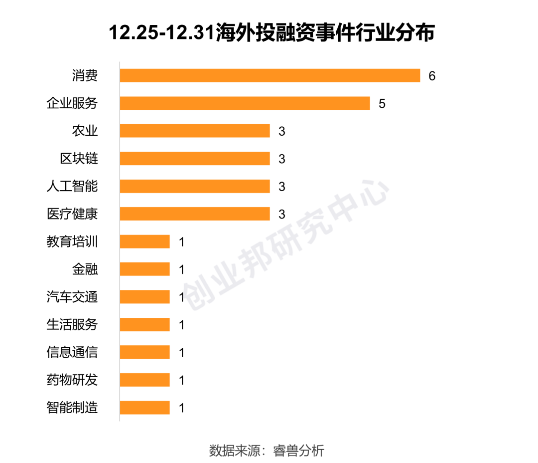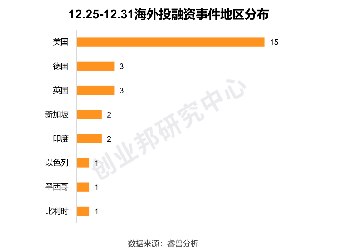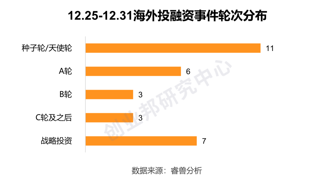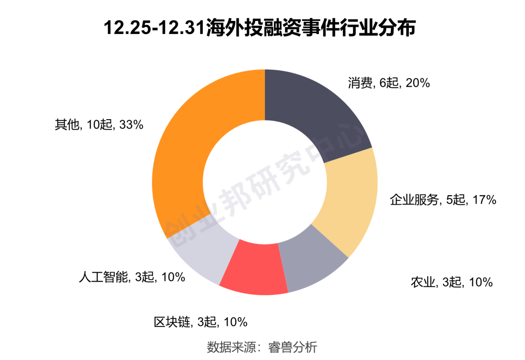 本周睿兽分析监测海外融资事件共计30起,其中国内机构参与事件数2起。并购事件5起。