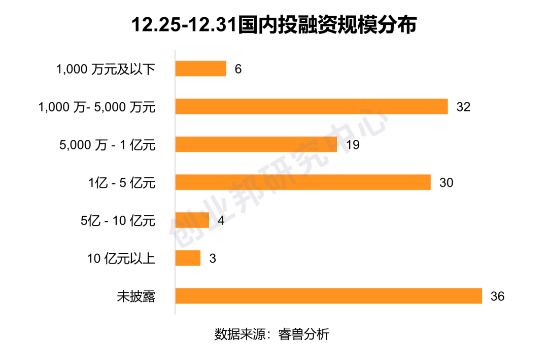 在已披露融资金额的事件中,本周融资规模在1.000万-5,000万元的最多,发生32起;其次是1亿-5亿元,发生30起。