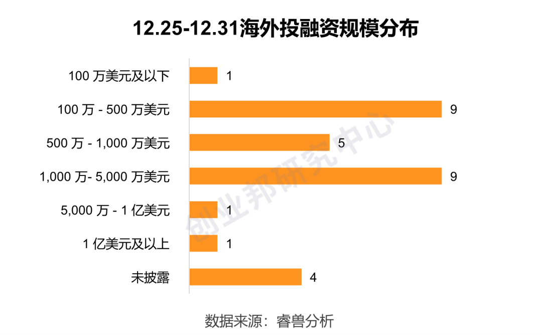 本周海外融资事件的融资规模主要集中在100万-500万美元和1,000万-5,000万美元,各9起。