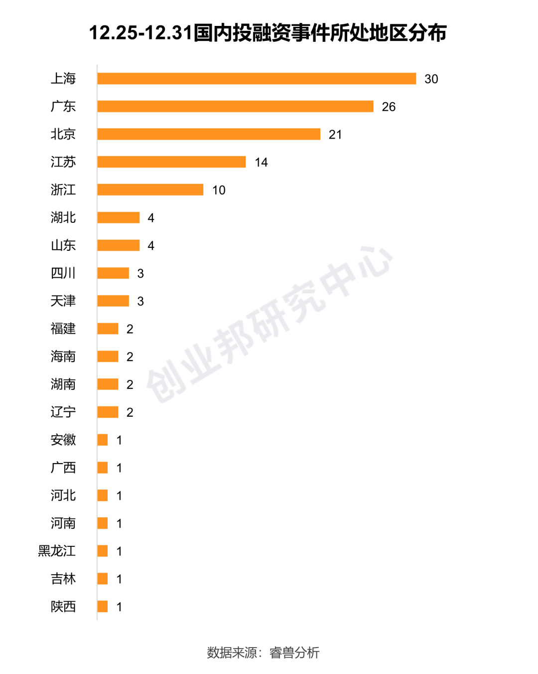 本周国内投融资最活跃的地区是上海,发生30起;其次是广东和北京,各有26起和21起,北上广地区占比59.23%。此外,江苏发生14起,浙江发生10起。