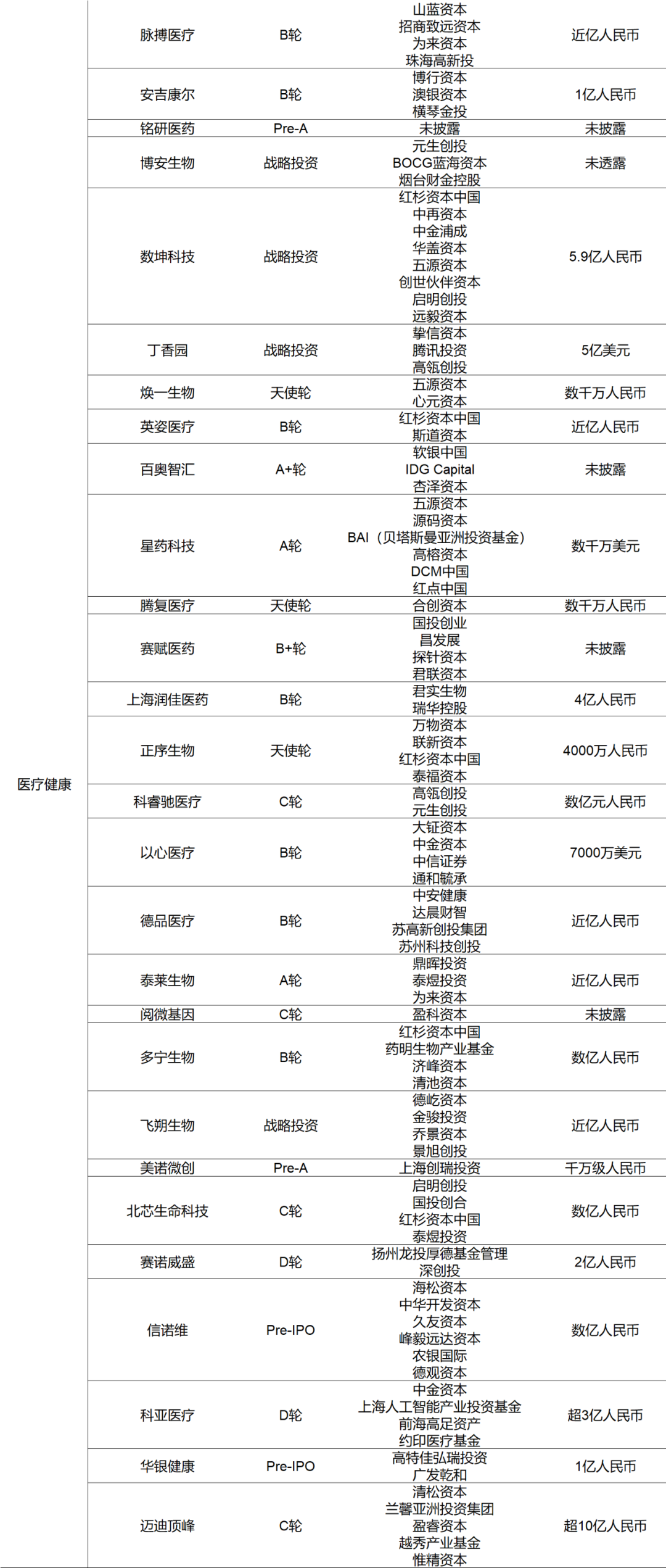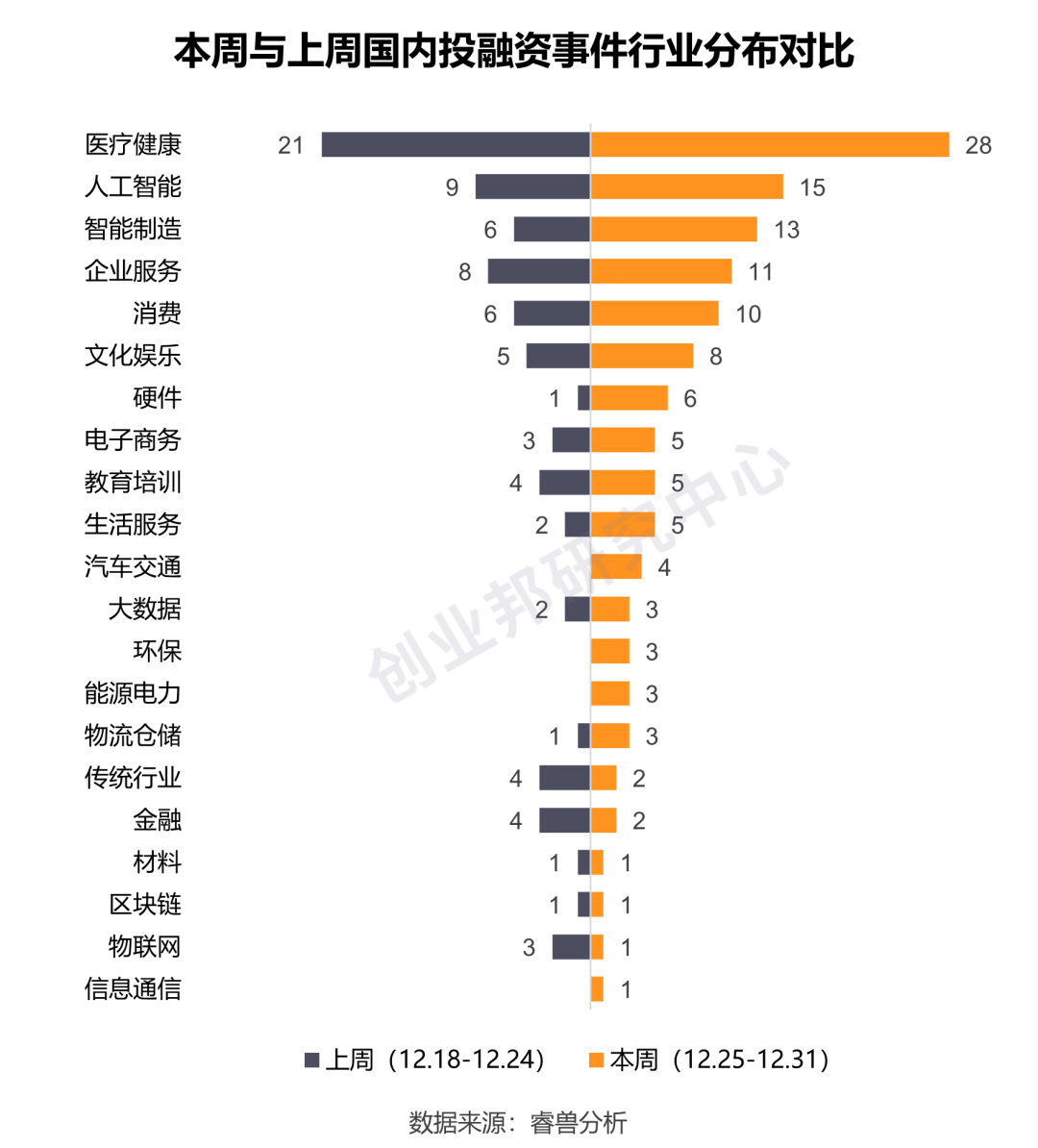 同上周相比,医疗、AI、智能制造和企服等热门领域呈现出持续火热的状态;传统行业和金融领域略有回落。