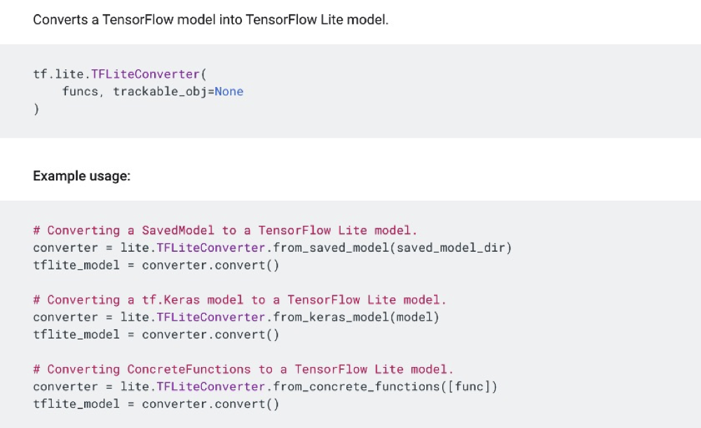 TensorFlow 2.2 将 TF Lite 生态进一步整合到了原生框架中,并正式推出了 tf.lite 模块。现在,你可以直接调用 tf.lite.TFLiteConverter 实现SavedModel、HDF5和ConcreteFunctions 等多种模型格式转 tflite 格式。