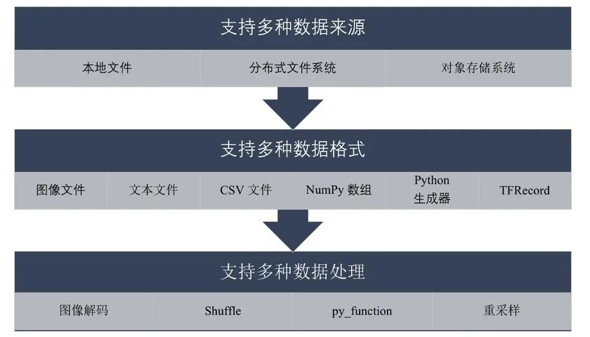 tf.data 是 TensorFlow 2.2 推荐使用的数据处理 API ,其强大的功能体现在对于多种数据来源、数据格式和数据处理方法的支持。对于个人开发者和小团队,可以使用本地文件和对象存储系统作为数据来源,对于拥有海量数据的大厂,则可以从分布式文件系统中分批次读取数据或搭建数据处理流水线。