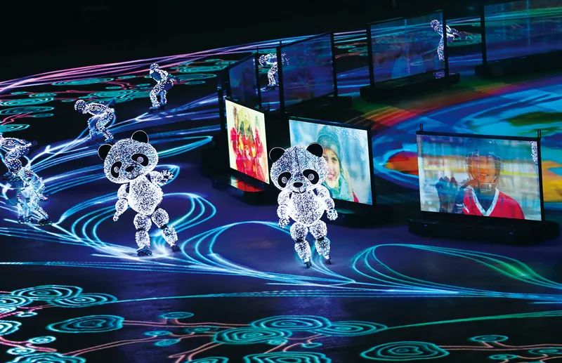 2018年2月25日,在平昌冬奥会闭幕式“北京8分钟”表演中,由沈阳新松机器人自动化股份有限公司研发的智能移动机器人与轮滑演员进行表演。 新华社记者 李钢/摄