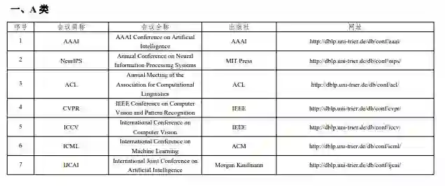 比如在“人工智能”领域,A类会议与2015版相比只是顺序调整了,入选会议仍然是AAAI、NeurIPS、ACL、CVPR、ICCV、ICML、IJCAI这7个。B类会议没有发生变化,C类则增加了NLPCC一个会议。