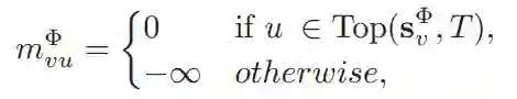 其中 是要保留的邻居的数量, 基于置信度 返回 个最可靠邻居的集合,然后将通过将其他邻居的掩码值设置为 来移除不可靠邻居。softmax下, 时,节点 将被有效屏蔽,因为softmax对于 的输出为零。