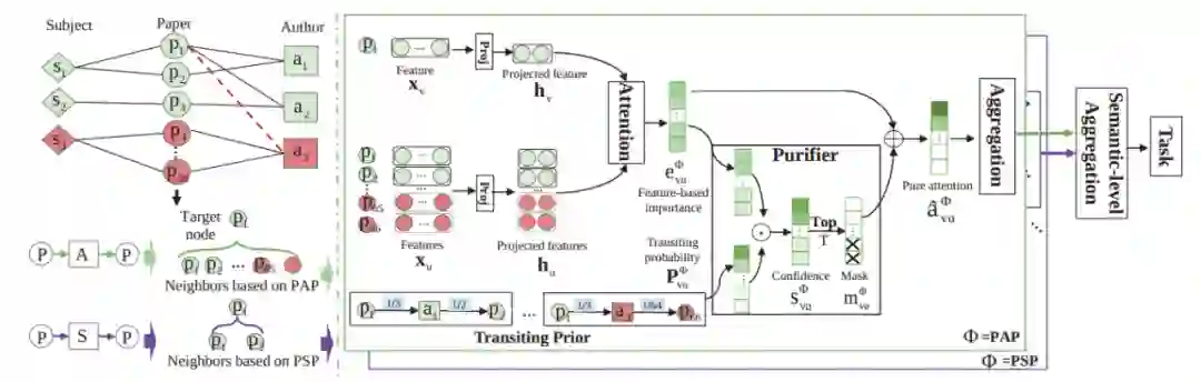 至此,这种方法增强了节点级注意,编码了元路径邻居的转移概率,只聚合top- 的可靠邻居,缓解了扰动扩大和软注意机制问题。最后,最终的被纯化的注意力值 将用于聚合邻居以实现特定语义的嵌入 :
