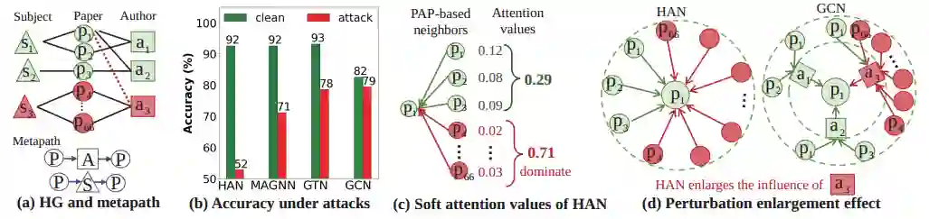 为了回答这个问题,我们测试了HGNNs的对抗鲁棒性,我们发现它们在ACM数据集上对于相同的逃逸拓扑对抗攻击(在测试阶段扰动)下的性能,攻击结果如图1(b)所示。令人惊讶的是,与GCN下降约3个点相比,HGNNs(即HAN、MAGNN和GTN)平均大幅下降约28个点。显然,HGNNs与GCNs的对抗鲁棒性存在显著差异,这促使我们进一步研究GCNs与HGNNs在模型设计上的差异。在对攻击结果的进一步分析中,我们观察到攻击者倾向于恶意地将目标节点链接到度很高的节点(即hub)。以HAN为例,攻击者在图1(a)中注入一个对抗边 ,这将导致恶意(红色)论文 在元路径PAP下成为 的直接邻居。即使它们被分配了较小的注意值,它们仍然可以主导HAN中 的接受域。