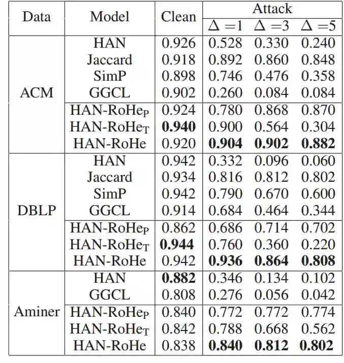 RoHe在HAN上的对抗防御效果实验:在三个数据集上的不同程度的攻击实验证明了我们方法的防御能力。由于没有现成的 HGNNs 防御框架, 我们直接将同质图神经网络的防御策略( Jaccard、GGCL和SimP)简单适应到HGNNs中。同时提出两个RoHe的变种方法: (只保留转移概率) and (只保留mask操作用于剪枝)。发现我们的对抗防御效果最好,同时在clean数据集中也获得了comparable的效果。