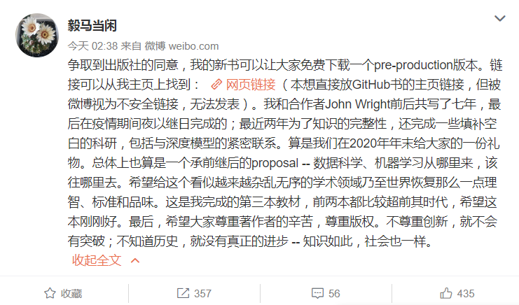 马毅教授表示,这本书他与合著者 John Wright 前前后后共写了七年,最后在疫情期间完成。此外,为了知识的完整性,他们还完成了一些填补空白的研究,包括与深度模型的紧密联系。最后,马毅教授认为,本书总体上算得上一个承前继后的 proposal,包括数据科学、机器学习从哪里来以及该往哪里去。