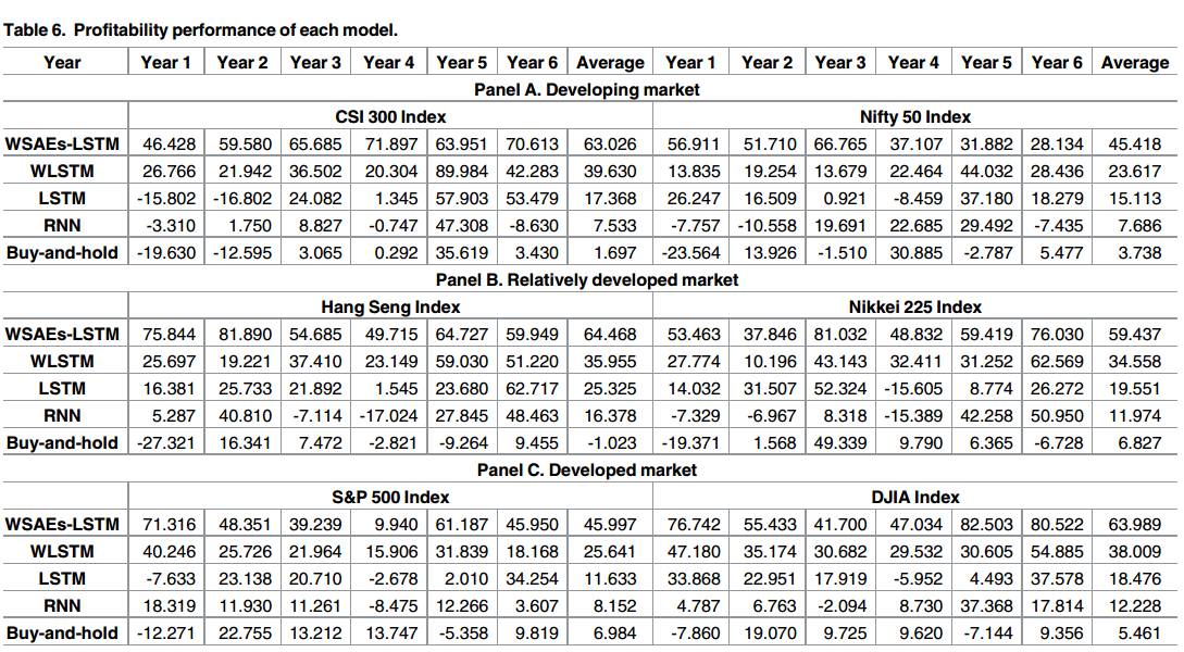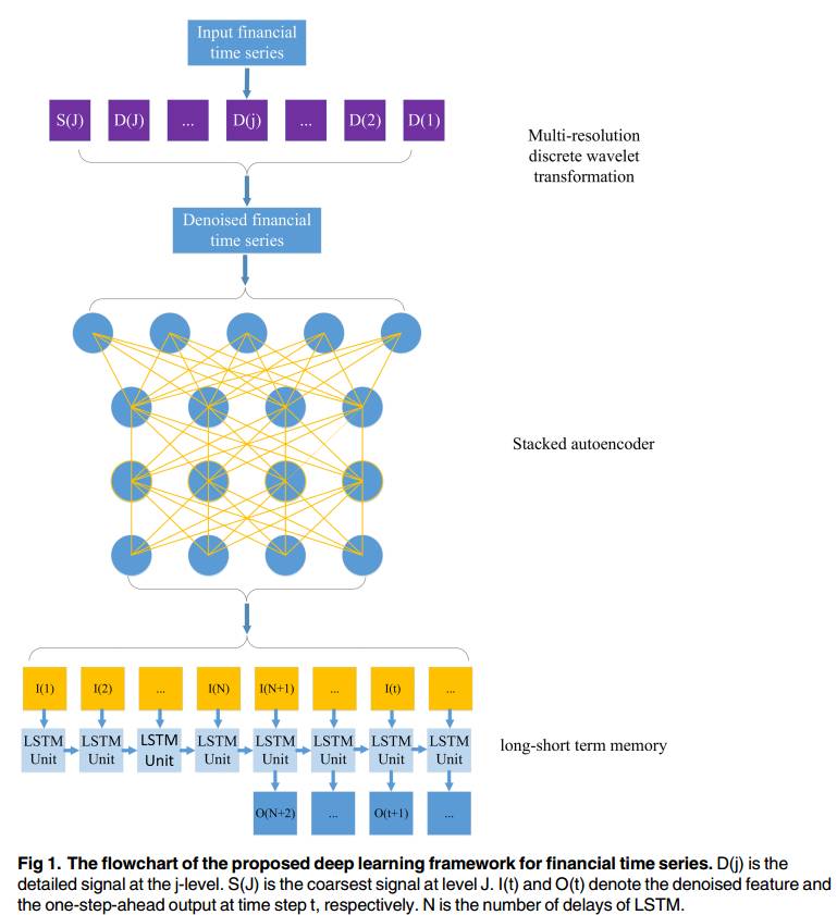 The application of deep learning approaches to finance has received a great deal of attention from both investors and researchers. This study presents a novel deep learning framework where wavelet transforms (WT), stacked autoencoders (SAEs) and long-short termmemory (LSTM) are combined for stock price forecasting. The SAEs for hierarchicallyextracted deep features is introduced into stock price forecasting for the first time. The deeplearning framework comprises three stages. First, the stock price time series is decomposed by WT to eliminate noise. Second, SAEs is applied to generate deep high-level features forpredicting the stock price. Third, high-level denoising features are fed into LSTM to forecastthe next day’s closing price. Six market indices and their corresponding index futures arechosen to examine the performance of the proposed model. Results show that the proposedmodel outperforms other similar models in both predictive accuracy and profitabilityperformance.