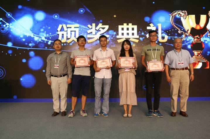 中国人工智能学会科普工作委员会秘书长、北京工业大学于乃功教授(右三)、北京盛开互动科技有限公司CEO曾祥永(右二)、中科曙光解决方案中心副总工程师明立波(右一)为三等奖颁奖