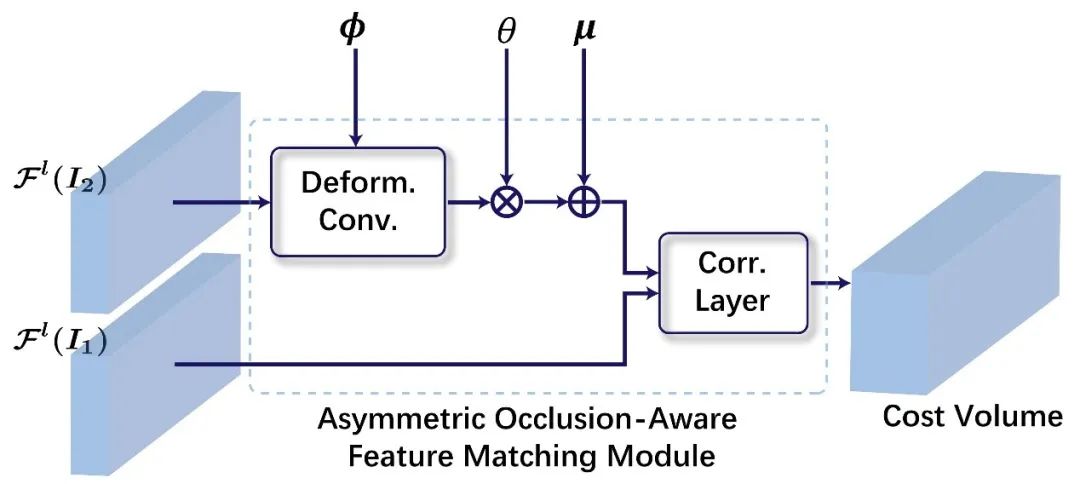 图2:可学习遮挡掩模的非对称特征匹配模块(AsymOFMM)