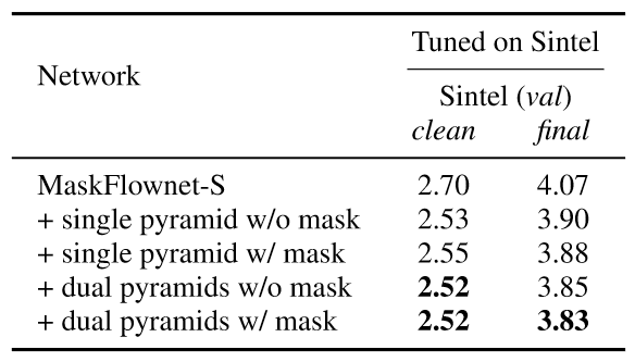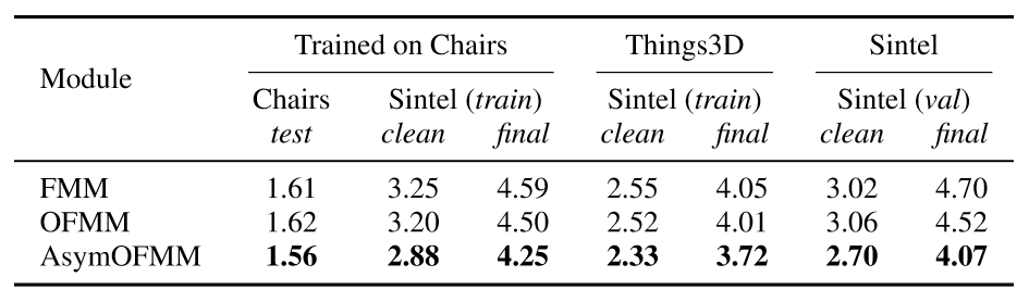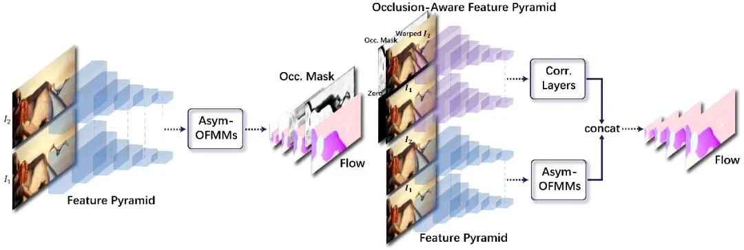 我们提出了可学习遮挡掩模的非对称特征匹配模块,该模块可以被轻松结合到端到端的基础网络中,不需要任何额外数据就可以学习到遮挡区域,并且能显著改进光流预测的结果。