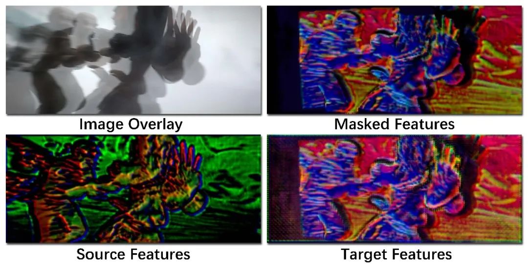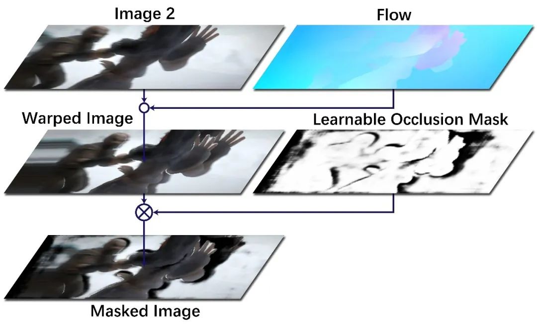 本文提出一种可学习遮挡掩模(learnable occlusion mask)的非对称特征匹配模块,不需要任何显式的监督信息就可以预测遮挡区域、过滤特征形变带来的无效信息。如图1,目标图像通过流场形变之后,可学习遮挡掩模预测的遮挡(黑色)区域准确地过滤了重影部分的干扰信息,得到了干净的掩模图像(masked image)。在这个简单的例子中就可以看到,原始图像与目标图像并非完全对等——后者在形变之后产生了重影,需要利用掩模信息进行过滤。