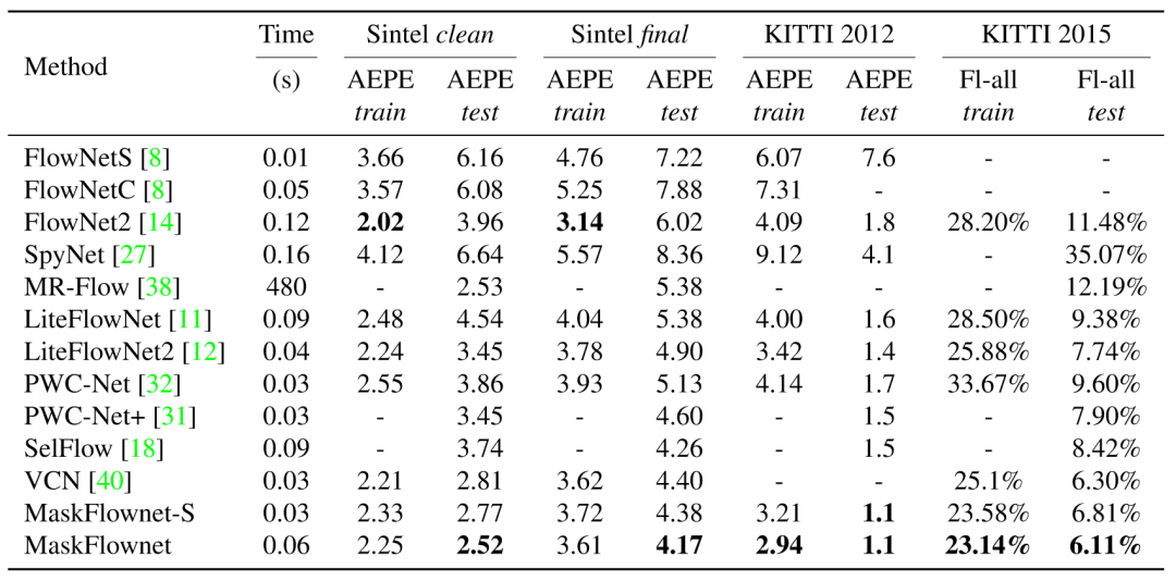 我们在 MPISintel、KITTI 2012 和 KITTI 2015 数据集上进行了广泛的实验。表1总结了我们的方法与其它方法相比的总体表现。其中,MaskFlownet-S 不使用级联部分、以 PWC-Net 为基础网络,仅仅将所有特征匹配部分替换为我们提出的可学习遮挡掩模的非对称特征匹配模块,就在所有数据集上都取得了实质性的提升。MaskFlownet 则进一步受益于级联网络,在所有测试集上都取得了所有方法中的最佳结果。