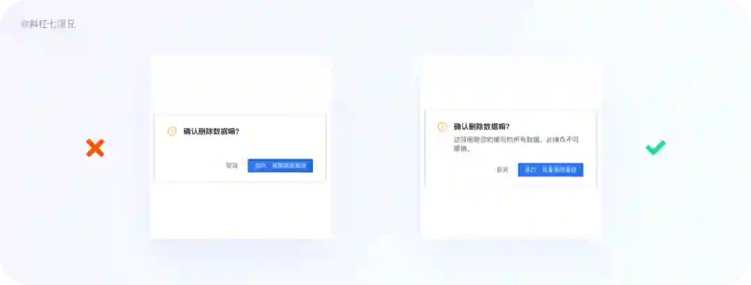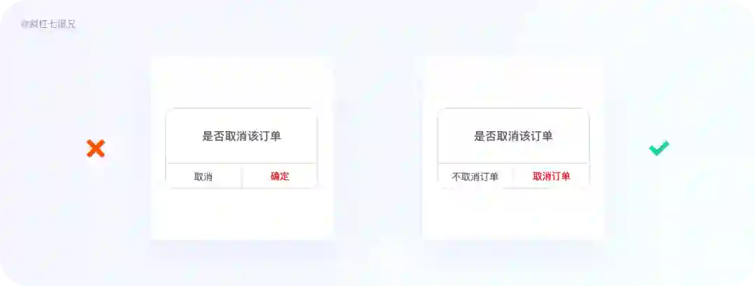 比如下面这个案例,我不可否认左面的案例看起来更加有效率,但是文案过于简单会引起用户的异议,因为“取消”在这个场景下也代表取消订单的意思,所以在简洁的同时,清晰、准确地传达信息更加重要。