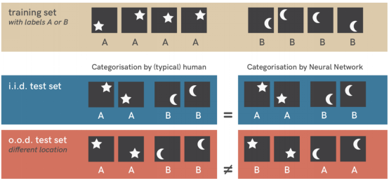 举一个例子,当在简单的星月数据集上训练时(顶行),标准的神经网络(三层,完全连接)可以轻松地对新的类似样本(数学上称为i.i.d.测试集)进行分类。但是,在稍有不同的数据集(o.o.d.测试集,最下面一行)上对其进行测试揭示了一种捷径策略:网络已学会将对象位置与类别相关联。在训练过程中,星星总是显示在图片的右上角或左下角;月亮则显示在左上角或右下角。这种模式仍然存在于来自i.i.d.测试集(中间一行)的样本中,但在o.o.d.测试图像(下排)中不存在,从而暴露了捷径现象。这里最重要的一点是,在训练设置约束下,位置和形状都是有效的解决方案,因此,没有理由期望神经网络更喜欢其中一个。然而,人类具有使用物体形状的强烈直觉。就像这个例子看起来那样,对抗性例子,偏向机器学习模型,缺乏领域通用性和输入略有变化引起的失效等都可以理解为捷径学习现象的实例。
