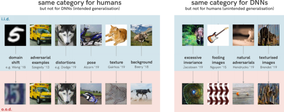 这种行为所引起的后果,是神经网络泛化能力的失败。下图左侧是人们期望模型进行泛化的几个方向。不管是手绘的黑白的还是彩色的门牌号,5都是5。同样,在姿态、纹理或背景上的轻微变形或变化也不会影响我们对图像中主要对象的预测。相比之下,DNN很容易被欺骗。有趣的是,这并不意味着DNN完全不能泛化:事实上,在对人类几乎没有意义的方向上,它们还是可以很好地泛化。下图的右侧显示了一些例子,从一些可理解的(置乱图像以仅保留其纹理)到完全不可理解。