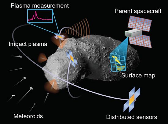 由流星撞击所产生的物质包括固体和熔融喷出物,但其中有些物质被蒸发和电离,形成等离子体,扩展到小行星周围的环境中。这种等离子体向外扩展,并提供有关小行星表面组成的信息。MIDEA可以使用10到50公斤的航天器母船,携带10个或更少的自由飞行传感器,每个大约重100克,对直径100到1000米的近地小行星(NEA)进行检测。在如此低的质量范围内,许多类似任务可以针对不同的小行星平行发射,在专门的就地资源利用(ISRU)任务之前对潜在目标进行广泛的调查。