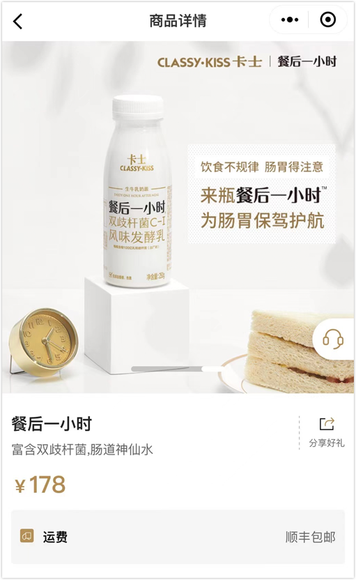 卡士微信官方商城显示,名为“餐后一小时”的益生菌酸奶,12瓶(250克/瓶)共计178元
