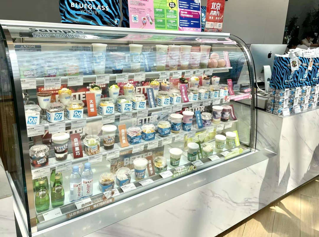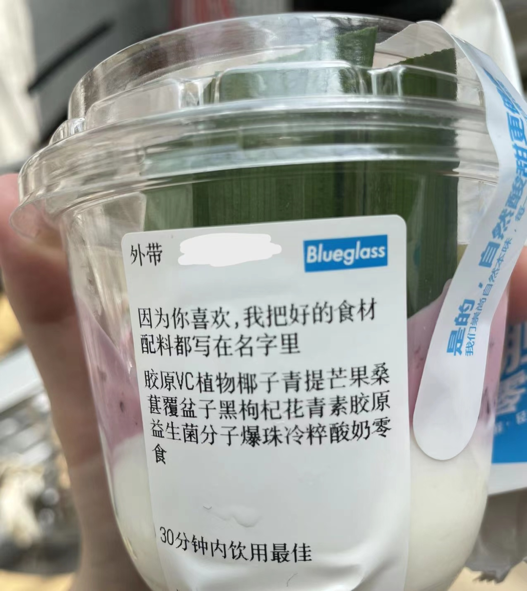 Blueglass的某款酸奶,杯身标签上,以原材料命名的产品名称占了三行有余 《凤凰WEEKLY财经》摄
