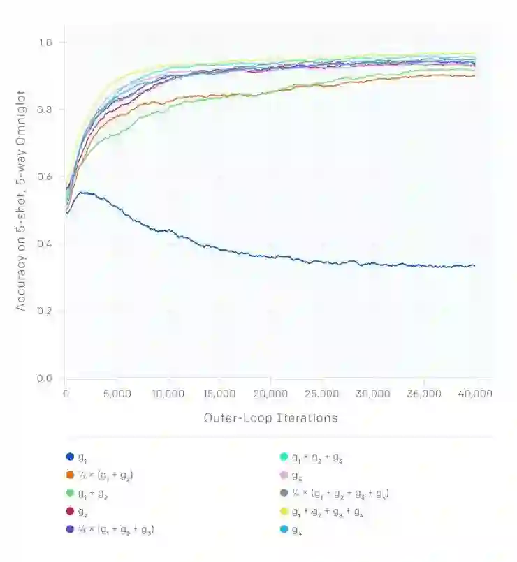 OpenAI对Reptile的分析也表明,通过对随机梯度下降的梯度做不同的组合,我们可以得到许多中不同的算法。假设每个任务中使用不同的minibatch进行k步随机梯度下降,得到的梯度分别为g1、g2、……、gk。下图就展示了在Omniglot benchmark中把每种不同的梯度和作为元学习的梯度的算法的学习曲线。g2对应的是一阶MAML,也就是最初的MAML论文中表述的算法。包括的梯度越多,算法学习得就越快,因为其中的方差会随之减小。可以注意到仅仅使用g1(也就是k=1时)并不会给这个任务带来什么改进,因为零样本学习无法被改进。