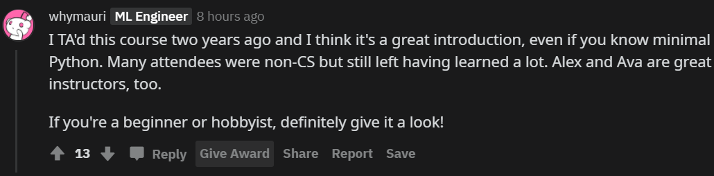 部分学生表示,这门课程不需要你有多深厚的基础知识,也不需要精通 Python,很多非计算机科学领域的学生也能受益匪浅。