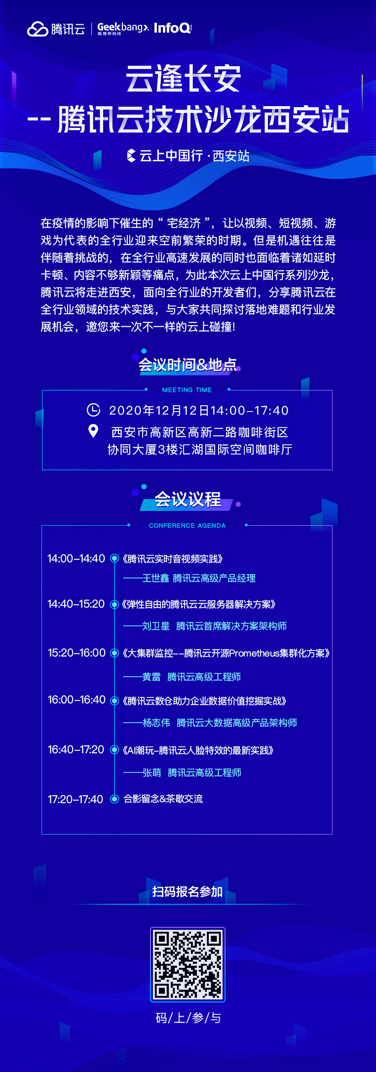 如果你有以上这些困惑,那你一定不要错过腾讯云在 12 月 12 日 14:00-17:40,举办的「云逢长安—腾讯云技术沙龙西安站」,沙龙邀请了 5 位技术大咖从实践出发,与大家分享腾讯云在音视频、云服务器、大数据、AI 人脸特效等落地场景中的技术奥秘,共同探讨行业发展机会。