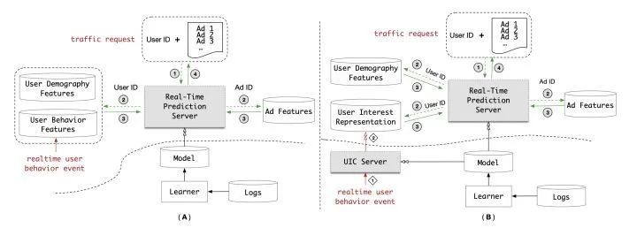 B架构将A架构的“用户行为特征(User Behavior Features)在线数据库”替换成了“用户兴趣表达(User Interest Representation)在线数据库”。