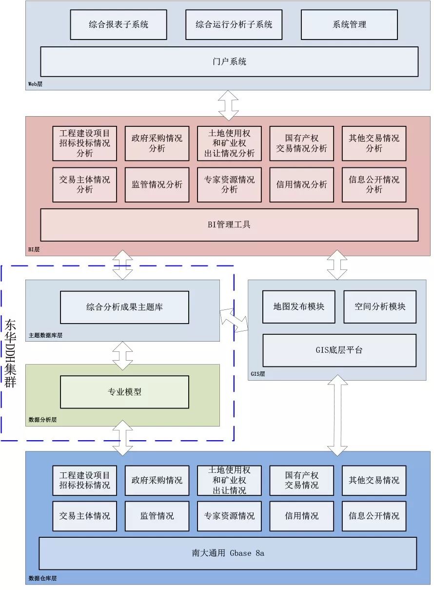 1)数据仓库层:采用南大通用GBase 8a产品,存储大规模结构化数据并且对外提供查询服务等。
