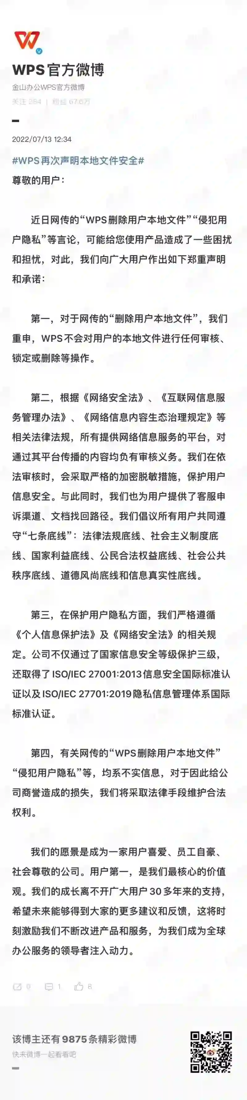 随着事件不断发酵,7 月 13 日,@WPS 官方微博 发文,再次回应“WPS 被曝会删除用户本地文件”一事,称近日网传的“WPS 删除用户本地文件”“侵犯用户隐私”等言论,向广大用户作出如下郑重声明和承诺:对于网传的“删除用户本地文件”,我们重申,WPS 不会对用户的本地文件进行任何审核、锁定或删除等操作。