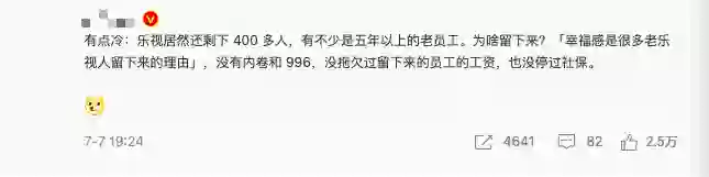 近日,有人在微博分享了一则“冷知识”:现在的乐视仍有 400 多名员工,无 996,无内卷。有网友因此开玩笑说,乐视员工这是过着“没有老板的神仙日子”。