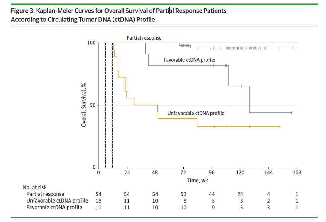 根据第6周的ctDNA变化谱来预估良性和恶性变化患者的总生存,HR为3.9,P=0.02;根据第12周的ctDNA变化谱来预估良性和恶性变化患者的总生存,HR为3.3,P=0.03. 在ctDNA变化谱属于良性的患者中(125例),取得部分患者的患者较疾病进展的患者,总生存更优(HR=0.09;95%CI:0.01-0.80;P<0.001)。取得PR的患者1年生存率为100%,良性和恶性ctDNA变化谱患者1年生存率分别为82%和39%,三组的总生存对比如下图3所示。