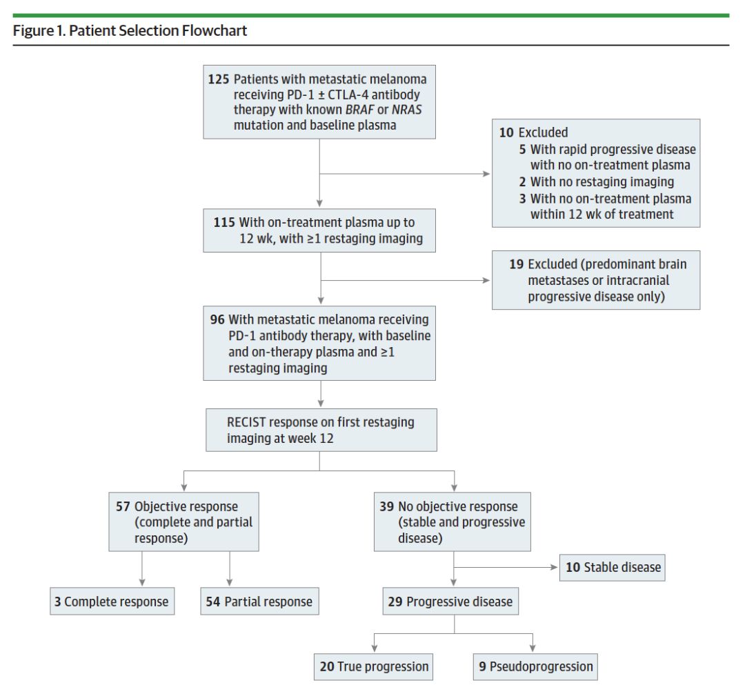PD-1抑制剂单药或联合ipilimumab已经成为转移性黑色素瘤的标准治疗方案。既往的研究显示,在接受抗PD-1单抗治疗的黑色素瘤患者中,基线或治疗8周内检测不到血浆ctDNA,预示着患者的治疗疗效更好,且预后更佳。假性进展,是指患者在治疗后出现新发病灶或靶病灶体积增大,在接受PD-1单抗治疗的患者中发生率超过10%。要确定患者是否为假性进展,需要后续进行影像学检测进一步确认,目前识别假性进展仍然是临床一大难题,尽管提出了免疫相关疗效评价标准(irRC)。本研究中,作者对接受PD-1单抗治疗的黑色素瘤患者进行基线或治疗早期ctDNA的监测,评估其能否区分免疫治疗的真性或假性进展。
