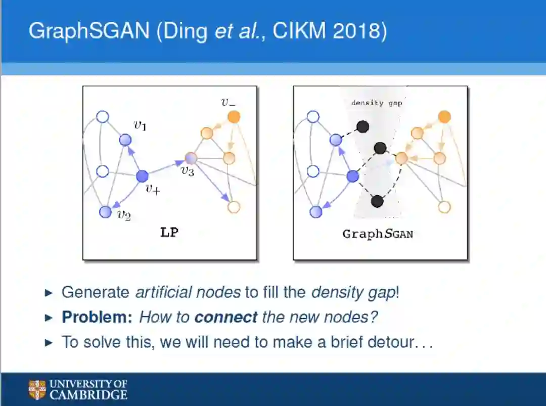 后面,Petar接下来主要介绍了Dinget al.(CIKM 2018)的文章Semi-supervisedLearning on Graphs with Generative Adversarial Nets(https://arxiv.org/pdf/1809.00130.pdf)。这篇文章提出了GraphSGAN,一种关于图的半监督学习的新方法。在GraphSGAN中,生成器和分类器网络扮演着一种新颖的竞争游戏。在平衡状态下,生成器在子图之间的低密度区域生成假样本。为了区分假样本和真实样本,分类器隐式地考虑了子图的密度特性。为改进传统的归一化图拉普拉斯正则化,提出了一种有效的对抗性学习算法,这个方法在图上使用GAN上的思想值得大家借鉴一下。