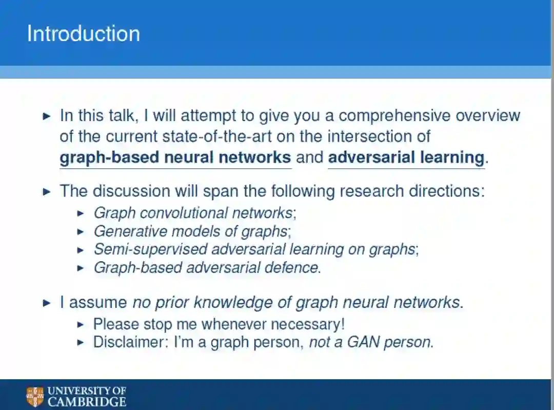 在这次演讲中,作者将尝试对当前最前沿的基于图的神经网络和对抗学习给出一个全面的概述。