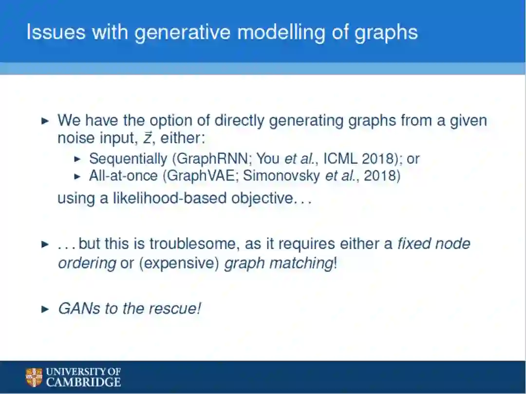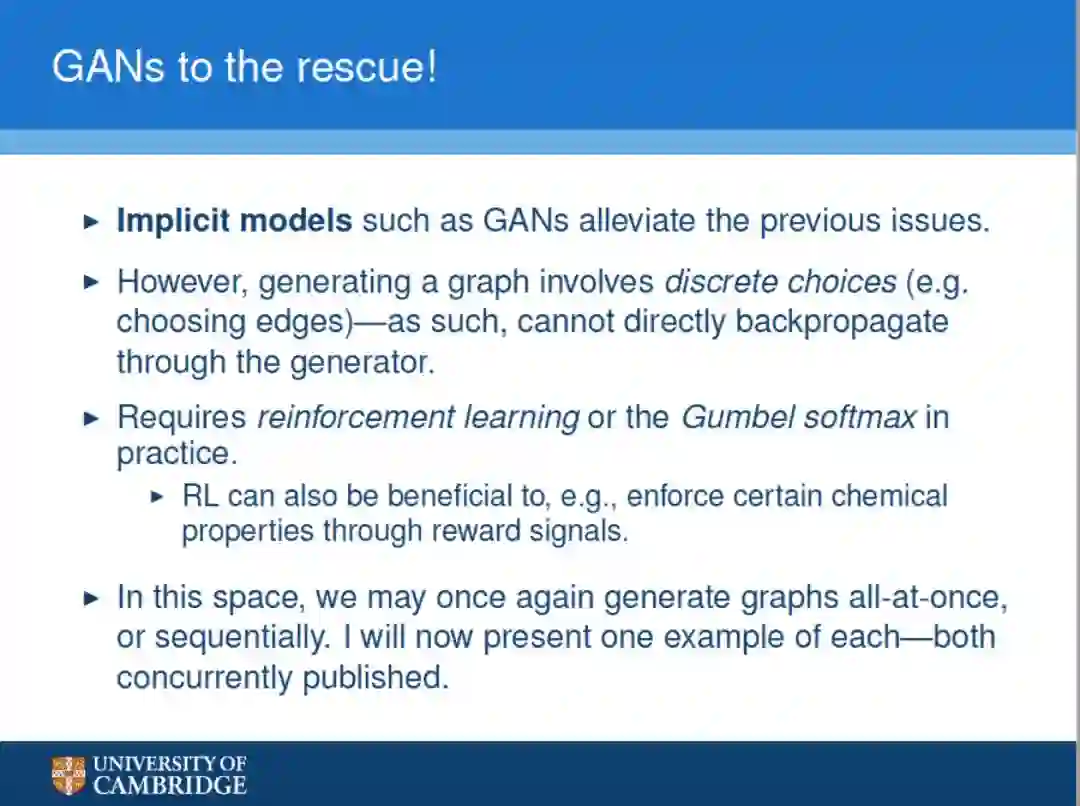 GANs等隐式模型能够缓解了前面的问题。然而,生成图涉及到离散的选择(例如选择边)——因此,不能直接通过生成器反向传播。
