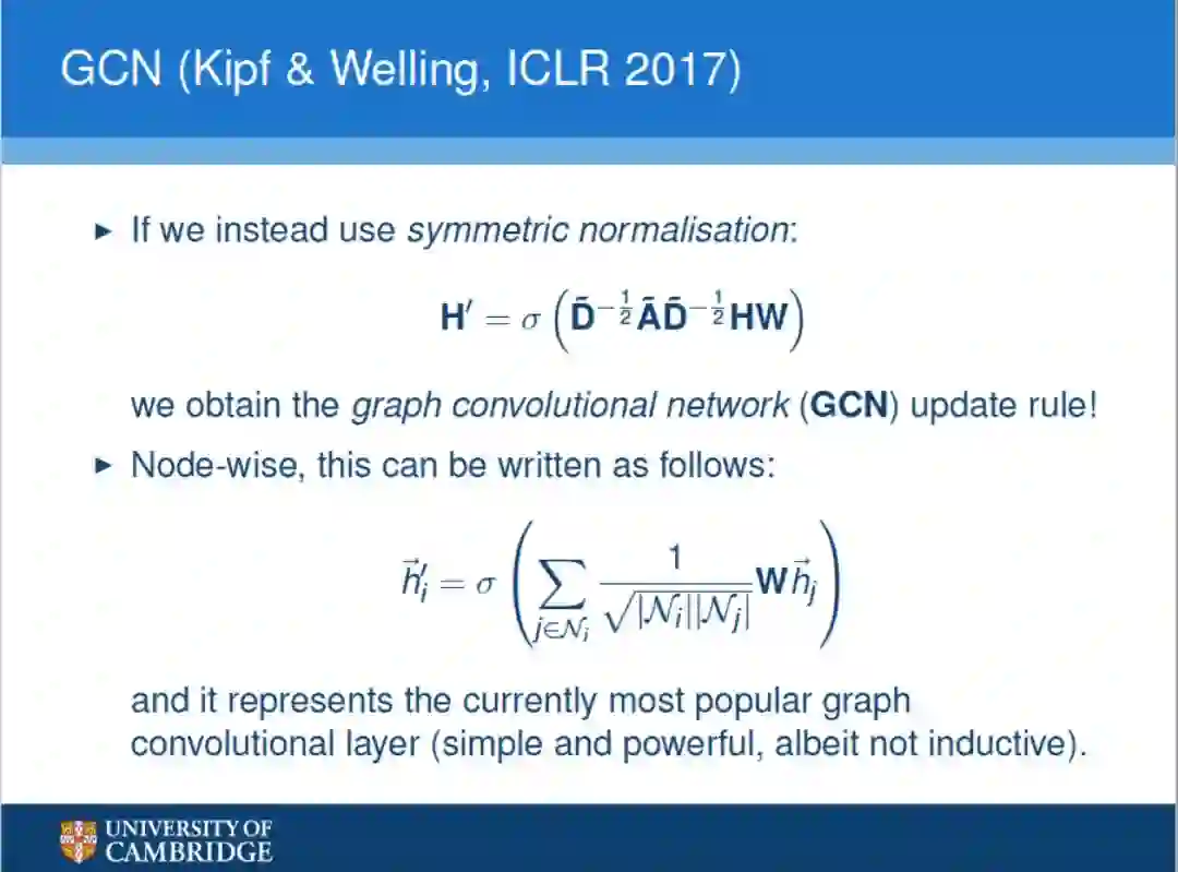 这四页ppt主要介绍图卷积算子的数学计算公式以及Kipf & Welling(ICLR 2017,http://arxiv.org/abs/1609.02907)的文章。