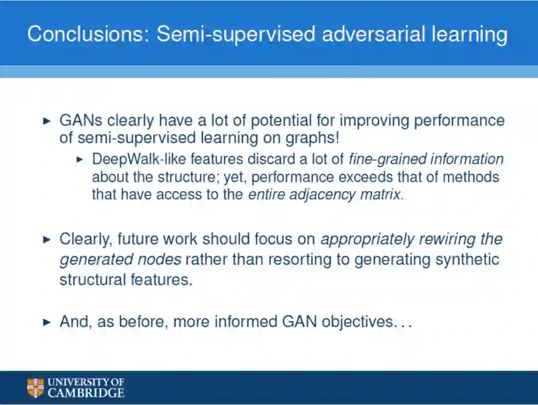 最后,Petar指出在基于图的半监督学习上,GAN对于提升性能有很大的优势。未来的工作应该聚焦于合适地对生成的节点进行重新连接,而不是使用生成合成的结构特征来辅助。