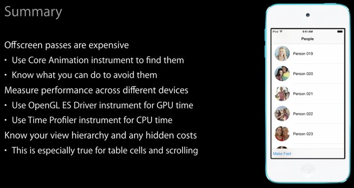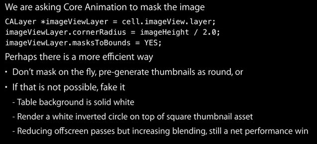 不要使用不必要的mask,可以预处理图片为圆形;或者添加中间为圆形透明的白色背景视图。即使添加额外的视图,会导致额外的计算;但仍然会快一点,因为相对于切换上下文,GPU更擅长渲染。