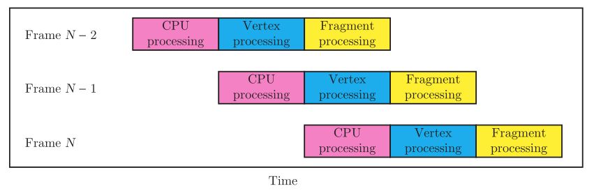 由于每一帧的顶点和像素处理相对独立,iOS会将CPU处理,顶点处理,像素处理安排在相邻的三帧中。如图,当一个渲染命令提交后,要在当帧之后的第三帧,渲染结果才会显示出来。