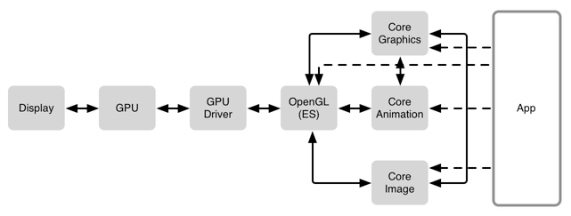 下图是另外一种表现的形式。在屏幕上显示视图,需要CPU和GPU一起协作。一部数据通过CoreGraphics、CoreImage由CPU预处理。最终通过OpenGL ES将数据传送到 GPU,最终显示到屏幕。
