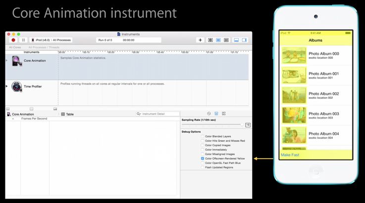 使用instruments的CoreAnimation工具来检查离屏渲染,黄色是我们不希望看到的颜色。
