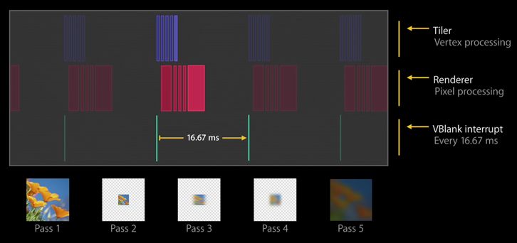 几何形状会分解成若干个tiles,对于每一块tile,把必须的几何体提交到OpenGL ES,然后进行渲染(光栅化)。完毕后,将tile的数据发送回cpu。