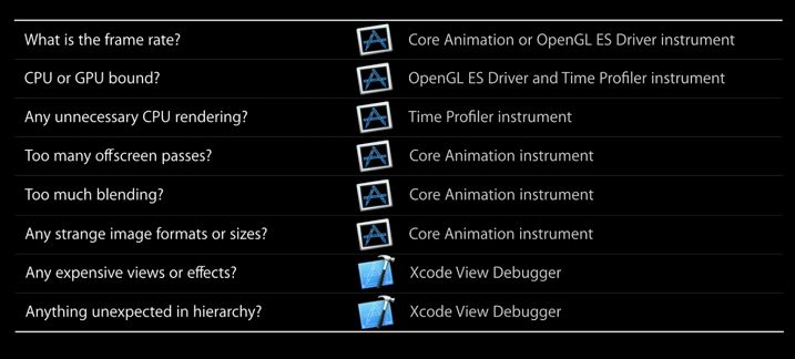 view hierarchy和instruments网上资料很多,OpenGL ES的你可以看OpenGL ES文集。