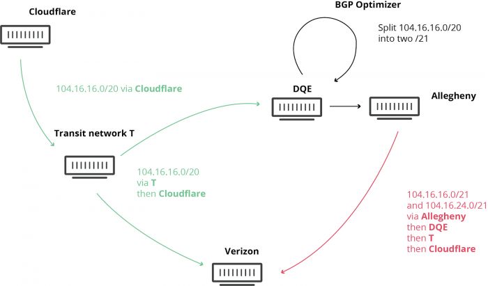 事故的起因是宾夕法尼亚州的一家小型 ISP AS33154 - DQE Communications 使用 Noction 的 BGP 优化器优化其内部网络的路由,它的内部路由优化本不应该通告世界其它网络服务器,然而由于错误配置,它向客户 AS396531 - Allegheny Technologies 宣布了特定的路由信息,然后这些路由信息又发给了转运服务商 Verizon,而 Verizon 又不加甄选的接受了路由公告,于是互联网高速公路的巨大流量被路由经过了一条羊肠小道,导致的结果显而易见。Cloudflare 建议网络运营商部署 RPKI,不接受这种优化路由的特定前缀公告。