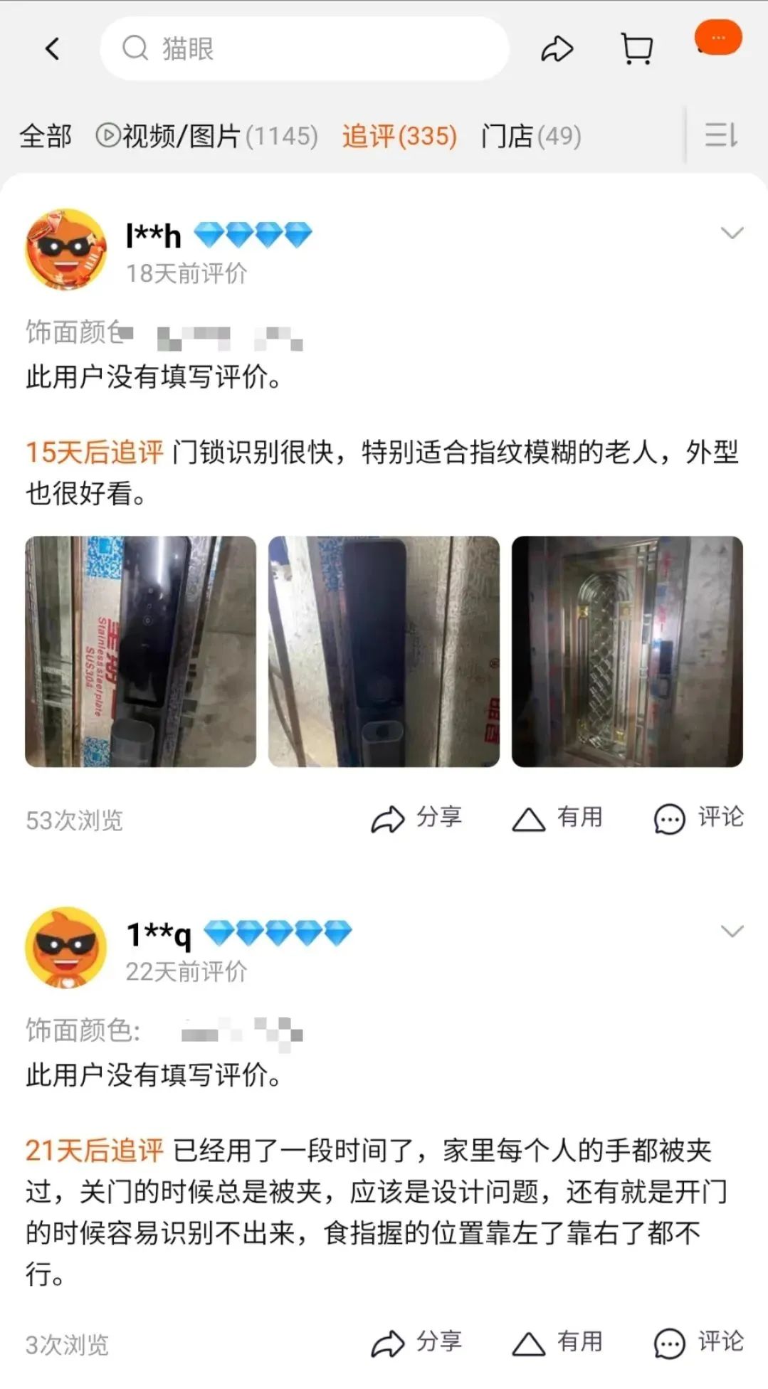 例如在某款智能门锁的评价区就能看到,两位起初没有发表任何评价的用户,在追评中给出了两种完全不同的说法,恰好对应该产品的卖点和使用痛点。