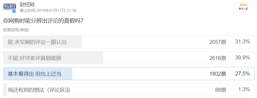 财经网曾经以网购时能否分辨出评论真假为题做过一次调查,6563人参与,有2057人能将水军刷的评论一眼就能认出。2616人表示真假难辨,另有1802人虽然看得出刷评痕迹,但也上了当。